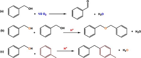 圖1所示,對于我們的銠活性炭催化劑,如果在布朗斯臺德酸中心存在下,芐醇氧化成苯甲醛可能發(fā)生平行反應(yīng):(a)苯甲醇氧化成苯甲醛(不需要酸中心)和副產(chǎn)物形成水。(b)兩分子芐醇縮合形成一分子二芐基醚,并除去水分子。(c)芐基化反應(yīng),包括從芐醇向甲苯分子中加入芐基碳陽離子(未顯示),并除去水分子以形成甲基-二苯基甲烷異構(gòu)體等。