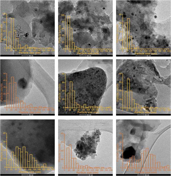 粒徑的變化在許多催化應(yīng)用中是至關(guān)重要的,并且使用硝酸的原理正是為了誘導(dǎo)這些變化。為了通過實驗驗證該假設(shè),對于所有九種載銠活性炭催化劑,通過TEM系統(tǒng)地評估Rh納米顆粒的粒度和分布。