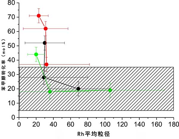 很明顯,這些粒徑范圍非常寬,我們認為考慮這樣的大顆粒對氧化反應(yīng)具有活性是不現(xiàn)實的。在其它術(shù)語中,因子或參數(shù)是該預(yù)治療效果有在銠粒子的大小,但另外一個因素或參數(shù)是在銠粒徑變動的影響對催化活性。圖3值得注意的是,對于高于約的顆粒。30-40nm不再觀察到與催化轉(zhuǎn)化的變化或相關(guān)性,表明粒度不再是活性參數(shù)。我們認為該值是銠對芐醇氧化的活性的近似上限直徑,或者反過來對該反應(yīng)有活性要求小于約30納米。我們認為這個結(jié)論雖然是一個廣泛的估計,但與未來基于這種金屬的催化劑開發(fā)相關(guān)。