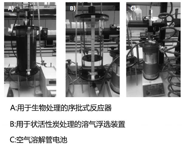 污水處理廠的活性污泥用于承載微生物,收集活性污泥并對其主要參數(shù)進行表征銨,硝酸鹽,亞硝酸鹽,磷酸鹽,化學(xué)需氧量,生物需氧量,總懸浮固體和pH每周一次,并儲存在4°C直至使用。將5L活性污泥泵入生物處理的序批式反應(yīng)器,混合并充氣2小時,然后使污泥靜置30分鐘。將1.7L上清液轉(zhuǎn)移至活性炭處理的溶氣浮選裝置單元,其中加入粉末狀活性炭并混合(30分鐘)。下一步包括加入凝結(jié)劑聚氯化鋁,12分鐘后加入絮凝劑。最后,將飽和水注入活性炭處理的溶氣浮選裝置裝置,開始分離步驟(12分鐘)。整個過程持續(xù)了大約四個小時。