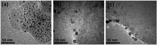 圖1:(a)250℃(b)350℃和(c)450℃下熱活化的載銀簇活性炭催化劑樣品的TEM圖像。