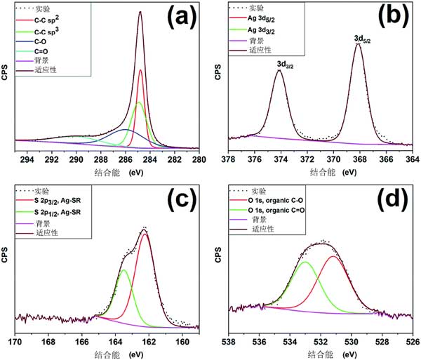 圖2顯示了所制備的活性炭樣品的組成元素的XPS光譜。XPS測量圖顯示碳,銀,硫和氧作為構(gòu)成元素的存在。S 1p光譜配有多個(gè)高斯分量,這些物種通常存在于活性炭表面上。圖2(b)分別顯示了多個(gè)峰,它們與零價(jià)態(tài)的銀原子一致。S 2p光譜的高分辨率光譜的反卷積,如圖2(c)所示,顯示兩個(gè)自旋軌道分裂為〜1.2 eV的峰。O 1s光譜顯示出不對稱的曲線,表明活性炭表面存在多種氧物質(zhì)(圖2d)。光譜的反卷積產(chǎn)生兩個(gè),其可分別歸因于活性炭表面的C-O和C O物質(zhì),因此不存在金屬氧化物物質(zhì)。總之,XPS結(jié)果表明硫醇鹽配體保持附著在銀簇表面的表面上,并且在活性炭樣品中不發(fā)生銀原子的氧化。