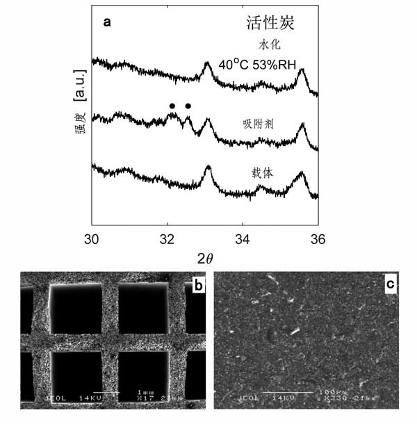 圖1a顯示了在40℃和相對(duì)濕度為53%下水合處理后活性炭載體,吸附劑和活性炭X射線(xiàn)衍射圖。由于碳酸鉀倍半水合物的反射特性的存在證實(shí)了鹽在載體上的負(fù)載。由于載體中加載的鹽量低,解釋了這些反射的低強(qiáng)度,5.58wt%。其余的峰對(duì)應(yīng)于載體中的不同相,例如碳和二氧化硅。圖1b顯示了活性炭載體的SEM照片。如圖中所看到的圖中,信道是正方形幾何形狀的具有每邊1.979±0.006毫米的長(zhǎng)度,并且所述通道之間的壁的厚度是0.651±0.022毫米。圖1c示出了通道的內(nèi)壁的表面上,他們看起來(lái)很同質(zhì)。