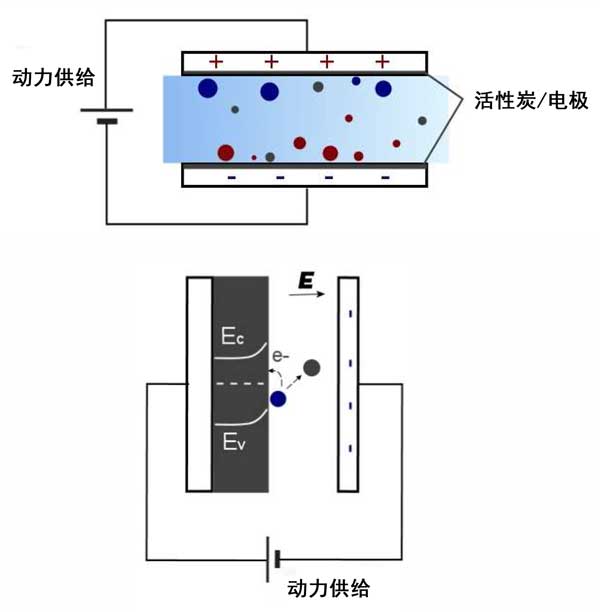 電吸附效應(yīng)包括向半導(dǎo)體氣體傳感器的敏感層施加外部電場,以改變其感應(yīng)行為。當(dāng)負(fù)電分子接近薄金屬導(dǎo)體的表面時,自由電子從固體表面被吸引。重要的是,如果處理具有較少可用位移電荷的半導(dǎo)體(例如活性炭),則靜電吸引所涉及的層的厚度將較大,而電導(dǎo)率將較低。半導(dǎo)體電性能的這種變化是金屬氧化物(MOS)氣體傳感器的基本操作。如果將所述系統(tǒng)放置在電場之間,例如通過在兩個電極之間施加電壓來感應(yīng),該電場可能會迫使電子朝向(或遠(yuǎn)離)(半)導(dǎo)體表面,從而降低(或增加)吸附某些氣態(tài)物種(圖1)。