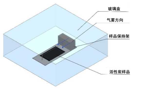 活性炭關(guān)于電場附增強(qiáng)吸附測試設(shè)備,由一個樣品架組成,樣品架放置在一個33厘米×33厘米×12厘米的帶有硼硅酸鹽玻璃壁的盒子內(nèi)(圖3)。風(fēng)扇(位于偏轉(zhuǎn)板后面)引起平行的空氣通量到樣品。在細(xì)的(直徑為180 µm)鎢絲電極(放電電極)上施加正電勢,而相對電極(活性炭)通過兩端的兩個接地連接接地。