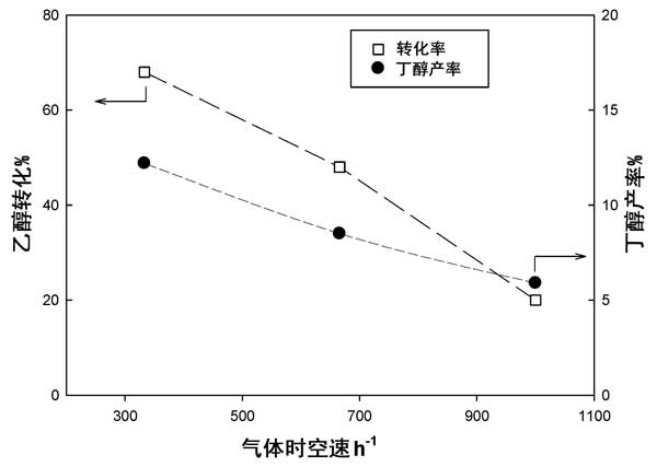 通過改變反應(yīng)器中的活性炭負(fù)載量,同時保持總流速和入口乙醇濃度不變,在400°C下初步研究了氣體時空速度對20%活性炭負(fù)載氧化鎂樣品的影響。結(jié)果以乙醇轉(zhuǎn)化率和丁醇產(chǎn)率報告于圖3。正如預(yù)期的那樣,乙醇轉(zhuǎn)化率通過降低氣體時空速度而增加。值得注意的是,對于較低的氣體時空速度值,制得丁醇的產(chǎn)率也增加。應(yīng)該注意的是,在我們的實驗中負(fù)載的最大催化劑量(1克)對應(yīng)于約3厘米的催化床高度。更長的催化劑床層將超過電爐的等溫區(qū),因此,未探索出較低的氣體時空速度值。另一方面,即使使用較大可能劑量的催化劑,在350°C下進(jìn)行測試所得到的丁醇產(chǎn)量也可忽略不計。