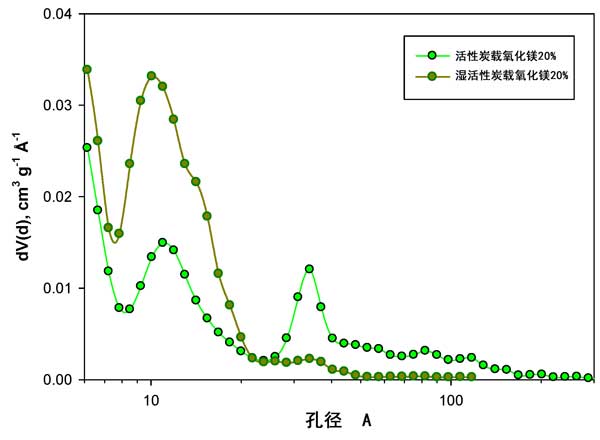 初步的TG分析20%氧化鎂負(fù)載量的活性炭與釋放的氣體進(jìn)行IR分析表明,硝酸鹽的分解在400°C以下完成。在此溫度以上,僅發(fā)生了Mg(OH)2緩慢轉(zhuǎn)變?yōu)镸gO的情況。因此,所有在600°C下處理過的催化劑均由分散在活性炭上的MgO組成,而沒有硝酸鹽前體鹽的殘留。圖1報告了不同負(fù)載下的活性炭和負(fù)載了氧化鎂的活性炭催化劑的孔徑分布(PSD)。
