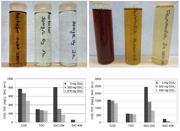 圖2:經(jīng)過臭氧化處理對預處理的水熱碳化用過的纖維廢水(左)和細覆蓋廢水(右)的影響。