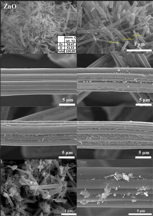 圖1:摻雜ZnO的活性炭纖維以及與活性炭結合的CuO-ZnO的FE-SEM圖像。