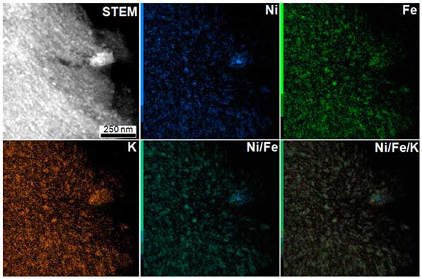 進(jìn)行EDX映射以獲得有關(guān)顆粒的局部化學(xué)組成的更多信息。作為示例,圖2呈現(xiàn)了活性炭載鎳材料的EDX映射。如觀察到的圖2中,鎳和鐵,還鉀的存在下,在該材料檢測。這三種金屬的EDX映射的疊加顯示出完美的匹配,表明納米粒子結(jié)構(gòu)中存在所有這些金屬。除小顆粒外,還觀察到一個位于碳末端的大顆粒,并且鎳比其他金屬富集。對于活性炭載銅和銦在顆粒結(jié)構(gòu)中也發(fā)現(xiàn)了鉀的存在。