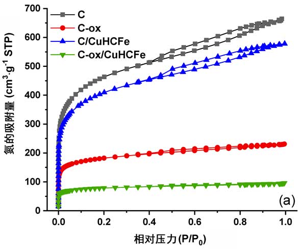 這些樣品的氮吸附等溫線和孔徑分布如圖3所示。。盡管活性炭和活性炭負(fù)載過渡金屬樣品的等溫線是I/IV型,結(jié)合了微孔和中孔性,但很難觀察到這些曲線的中孔部分,而活性炭負(fù)載過渡金屬樣品的等溫線幾乎消失了,說明了中孔性。該觀察結(jié)果與孔徑分布曲線一致,進(jìn)一步顯示了孔徑和尺寸的減小。另外,我們注意到,在兩種情況下,過渡金屬銅相的引入均導(dǎo)致窄的孔徑分布。這可能表明活性炭孔中存在一些顆粒。多孔性的降低和氧官能團(tuán)濃度的增加可能會影響銫的吸附性能。