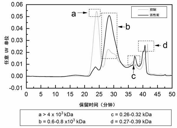 為了檢驗活性炭改變可溶性微生物組成,使其對膜具有更高的親和力這一假設(shè),通過GPC分析了構(gòu)成可溶性微生物的有機分子的大小分布(圖1)。在第二次可溶性微生物運行結(jié)束時收集了可溶性微生物樣品(圖1b),有趣的是,GPC色譜圖顯示了對照反應(yīng)堆和活性炭加入反應(yīng)堆之間的明顯差異。在活性炭反應(yīng)器的可溶性微生物中,保留時間為24分鐘時,來自對照反應(yīng)器的可溶性微生物的第一個峰顯著降低,而在活性炭反應(yīng)器的可溶性微生物中,在28分鐘時觀察到峰的上升(圖1,分別是峰值a和b)。活性炭反應(yīng)器的可溶性微生物中的37分鐘處的峰也升高(峰c)。可溶性微生物中某些有機化合物含量的變化(升高或降低)可能歸因于,由于微生物群落組成的變化或某些活性炭所觀察到的代謝活性增強,導(dǎo)致某些微生物產(chǎn)品的產(chǎn)生和分泌增加另外,或抑制進水橄欖油廢水中物質(zhì)的降解。有機化合物對活性炭顆粒的吸附只會降低其在可溶性微生物中的外觀。由于吸附到活性炭上,可溶性微生物中某些成分的減少(如峰a所示)也有可能優(yōu)先吸附其他成分,這些成分對通量的減少更不利,或者起膜調(diào)節(jié)前體的作用,這可能會增強生物膜的生長(例如峰b–d)。顯然,確定膜上有機污染物的身份是一項必不可少的任務(wù),目前,尚不清楚不同可溶性微生物組分對膜污染的詳細(xì)影響以及它們被活性炭的吸附。