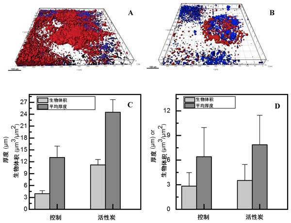為了分析由于在膜生物反應(yīng)器中添加活性炭而導(dǎo)致生物膜形成增加的可能性,并進一步闡明活性炭反應(yīng)器中膜性能下降幅度更大的原因,在第一個處理結(jié)束時進行了檢測(圖2A,B)。在比較兩個反應(yīng)器之間生物膜結(jié)構(gòu)的性質(zhì)時,可以觀察到活性炭反應(yīng)器通量下降的增加顯然與生物膜生長的幅度有關(guān)。在第一次膜生物反應(yīng)器運行結(jié)束時從模塊上獲取的兩塊膜上生物膜的CLSM分析顯示,活性炭和對照反應(yīng)器之間細(xì)胞的生物體積及其自相關(guān)EPS的差異很大(圖2)。當(dāng)補充活性炭時,生物膜生長的升高支持了膜滲透性的更高降低,這是由可溶性微生物組分吸附的升高引起的,這可能會更好地調(diào)節(jié)膜表面,從而增強生物膜的形成。