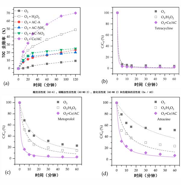 由于其可用性和可靠性,反滲透工藝已廣泛應用于城市廢水處理廠中的水再生利用;厥75-85%的給水時,會同時產生反滲透濃縮液,其中含有高濃度的鹽和有機物。此外,還含有各種新興污染物,如果將反滲透濃縮液直接排放到水生環(huán)境中,,盡管這些有機物的濃度較低,也會會造成嚴重的環(huán)境危害。在本研究中,制備了酸洗活性炭,硝酸改性活性炭,胺化活性炭和負載鈰的活性炭。研究了這些活性炭在反滲透濃縮液中臭氧化有機化合物的性能。提出了一種可能的機制,用于水中有機化合物的催化臭氧氧化。