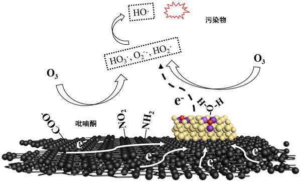 負載鈰的活性炭在臭氧氧化中可以很好的去除有機物,這主要是由于其各種去除機理,包括吸附,臭氧氧化和自由基氧化。吸附和臭氧化都是選擇性的。一些有機物在活性炭上緩慢吸附,因此非選擇性的羥基自由基氧化對于通過負載鈰的活性炭催化的臭氧氧化作用從水中去除難處理的有機化合物起著重要的作用。催化臭氧化系統(tǒng)中生成·OH的可能機理如圖3所示。通過這種機制,不僅可以通過表面官能團而且可以通過負載在活性炭上的鈰來刺激·OH的生成。由表面基團的自由基激發(fā)依靠其堿度和給電子效應。對于負載在活性炭上的鈰,氧化鈰表面的氧空位是催化活性位。ø 3可以具有氧空位或直接用H反應2 ö將其吸附在氧空位,以產生HO 3·,·O2 2-,HO 2·等自由基。這些自由基可以通過一系列鏈反應轉化為·OH。在自由基生成過程中,氧空位周圍的Ce 3+會失去電子,并被氧化為Ce 4+,這可能導致催化活性降低。因此,富電子結構(例如石墨烯層,-NO 2和吡喃酮)與氧化鈰之間可能發(fā)生電子轉移過程,從而導致Ce 4+的還原和催化活性的更新。這種協(xié)同效應可能是在負載鈰的活性炭表面快速連續(xù)產生·OH的關鍵。