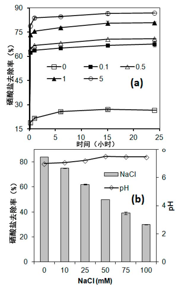 圖2:(a)銅涂層劑量[0,0.1、0.5、1.0和5.0 mmol 的載銅活性炭]對硒酸鹽吸附的影響,(b)溶液對硒酸根在銅包被的活性炭上的吸附的離子強度,以及吸附后溶液的pH,初始pH約為7.0。