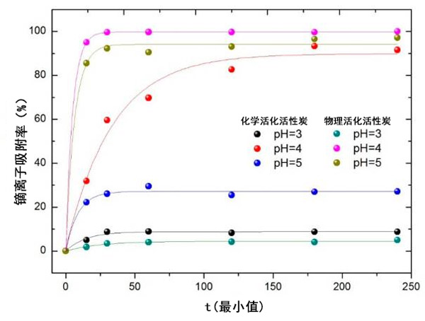我們系統(tǒng)的研究了三種不同參數(shù)對(duì)兩種類(lèi)型的活性炭吸附能力的影響:溶液的pH值,鏑離子濃度和活性炭量。