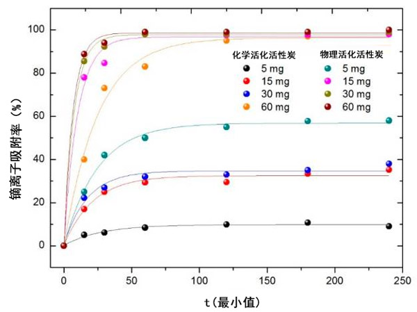 活性炭量的影響:最后,研究了活性炭吸附量的影響。將濃度為5 mg·L -1的鏑溶液與不同量的兩種活性炭(5、15、30和60 mg)接觸。結(jié)果繪制在圖5中。