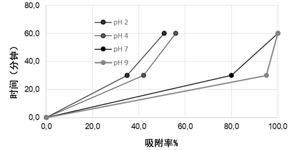 研究了pH值對三甲胺在活性炭上吸附的影響。在該過程中,發(fā)生吸附現(xiàn)象的溶液的pH值是非常重要的參數(shù),尤其是在三甲胺為布朗斯臺德堿的情況下。在官能團(tuán)和吸附劑表面之間產(chǎn)生的靜電荷的大小主要取決于介質(zhì)的pH。在pH值為2、4、7和9的情況下,用0.200g的活性炭測量了在0、30和60分鐘時三甲胺的吸附百分比,結(jié)果總結(jié)在圖3中。