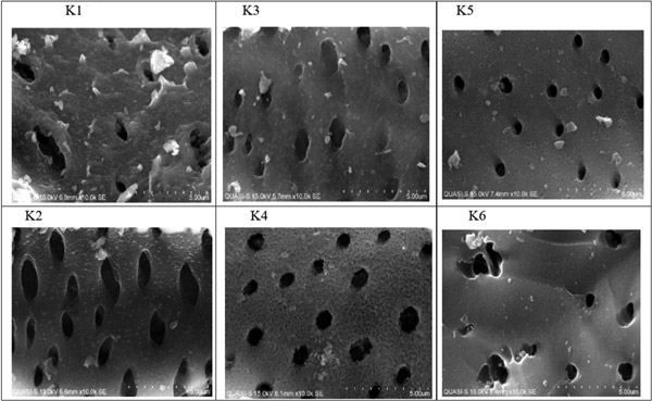 對(duì)原始活性炭(圖3中的K1)的掃描顯示出相當(dāng)均勻的孔;钚蕴康慕Y(jié)構(gòu)可以看作是薄片,為不規(guī)則分布和各種尺寸的孔提供了較大的吸附面積。表面上的大多數(shù)可見(jiàn)孔都在5微米范圍內(nèi),這與對(duì)椰殼活性炭的預(yù)期一致,而在這5微米孔內(nèi)可以看到小于1微米的較小孔。圖3中的K2顯示了在氯酸鹽吸附到表面活性部位后活性炭表面的變化。這些孔有變化的跡象,因?yàn)槠渲幸恍┪铰人猁},而其他孔被氯酸鹽和氯化物分子阻塞。在10,000倍的放大倍率下,可以觀察到小孔周圍和大孔入口處的沉積,因?yàn)轭A(yù)計(jì)表面活性基團(tuán)會(huì)大量存在于這些區(qū)域;钚蕴康乃嵝栽偕鷺O有可能形成了表面活性部位,從而增強(qiáng)了活性炭吸附大量氯酸鹽的能力。