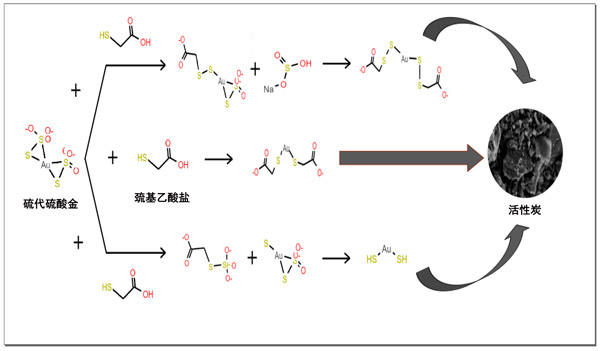 圖3:在水溶液中與硫代乙醇酸一起攪拌的未改性活性炭回收金的建議機理。