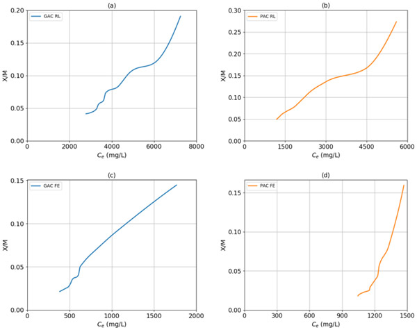 圖1顯示了顆;钚蕴颗c原浸出液,粉狀活性炭與原浸出液,粉狀活性炭與廢液以及粉狀活性炭與廢液的實(shí)驗(yàn)等溫線。兩個(gè)樣品的曲線和兩個(gè)活性炭對應(yīng)于S形的等溫線(II型)的行為,因?yàn)榍是凹向上,所以多層吸附進(jìn)行活性炭的表面上。利用該信息,就滲濾液而言,不管活性炭顆粒的性質(zhì)和大小如何,都可以假定吸附劑中殘留的化學(xué)需氧量是通過物理吸附發(fā)生的。