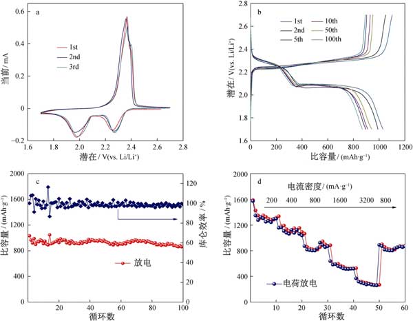 為了評(píng)估活性炭作為陰極的電化學(xué)性能,將鋰箔作為陽(yáng)極組裝到鋰硫電池的紐扣電池中。用于第一,第二和第三個(gè)循環(huán)的循環(huán)伏安圖(CV)曲線(xiàn)上在0.05毫伏·秒的掃描速率的電位窗口進(jìn)行(圖2A)。在第一循環(huán)期間,觀察到兩個(gè)陰極峰在2.26和1.97 V,CV曲線(xiàn)中最初的幾個(gè)循環(huán)幾乎重疊,這表明循環(huán)穩(wěn)定性極佳,容量保持率相對(duì)較高;钚蕴康暮汶娏鞒潆/放電曲線(xiàn)和循環(huán)穩(wěn)定性的測(cè)試中,如在圖中所描述2B、C;钚蕴侩姌O的首次放電容量為1045 mAh·g -1,約為硫理論容量的62.5%。此外,活性炭電極在第100次循環(huán)時(shí)也顯示出869.8mAh·g -1的放電容量。如圖2d所示測(cè)量活性炭的倍率性能,在200–3200 mA·g -1下表現(xiàn)出1260、1050、806、513、290 mAh·g -1的可逆放電容量。此外,當(dāng)電流密度達(dá)到800 mA·g時(shí),活性炭陰極的放電容量為802 mAh·g -1。多孔活性炭材料表現(xiàn)出中等的鋰硫電池電化學(xué)性能,顯示出高性能鋰硫電池的潛力。