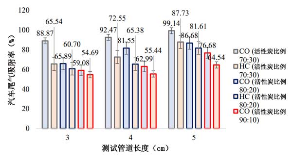 為了確定吸附管的長度對汽車尾氣中的CO和HC氣體排放吸附能力的影響。所用的活性炭是改性的。根據(jù)圖3所示的圖表,可以看出吸附管越長,CO和HC的吸附百分?jǐn)?shù)越高。這是因為吸附面積更長。吸附區(qū)域是活性炭與廢氣之間發(fā)生接觸的區(qū)域。吸附面積越寬,活性炭吸附的污染物氣體量就越大。因此,CO和HC的濃度將由于接觸面積而降低。
