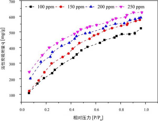 為了確定三氯乙烯初始濃度在進料流中的影響,研究了100、150、200和250ppm的濃度。維持其他實驗條件,活性炭顆粒大小為355μm,床溫為30°C,活性炭重量為50mg。入口濃度為100、150、200和250ppm時的吸附容量分別為523.252、575.844、593.181和624.044mg/g。隨著入口三氯乙烯濃度的增加,在壓力增加的情況下,活性炭的吸附容量顯示出穩(wěn)定的增加。在較高濃度下,隨著壓力的增加,吸附容量的增加可能是由于相鄰分子與微孔中的層內分子粘附所致。這導致形成粘附在吸附劑表面上的層內分子的相鄰三氯乙烯分子堆疊。三氯乙烯分子的平面形狀的動力學直徑為6.6。因此,它會積聚在活性炭的微孔/中孔上。在活性炭的微孔區(qū)域中具有大孔體積的情況下,假設縫隙形狀的孔幾何形狀,則期望對活性炭上的三氯乙烯具有高親和力。在低濃度(0-8000μg/L)的活性炭上進行了三氯乙烯的吸附,在室溫下吸附量為160mg/g。