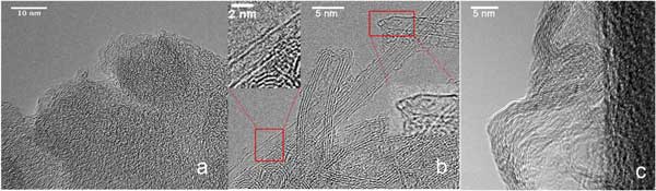 選擇了三種活性炭,代表三種不同的孔幾何形狀,同時保留了化學(xué)均一的吸附表面和可比較的孔徑。選定的樣品是由隨機排列的石墨層組成的活性炭,具有狹縫孔幾何形狀的碳化鈦衍活性炭和具有圓柱孔幾何形狀的活性炭納米管樣品。對活性炭納米管進(jìn)行熱處理,以去除端蓋,并使氣體進(jìn)入內(nèi)部孔隙。選擇加熱條件以將活性炭納米管的開孔率和BET表面積調(diào)整到與其他兩個碳樣品相當(dāng)?shù)乃,同時還清潔表面并去除雜質(zhì)。所有三個樣品的特征如下:使用透射電子顯微鏡(TEM)圖1證明了這些材料的孔幾何形狀的差異。
