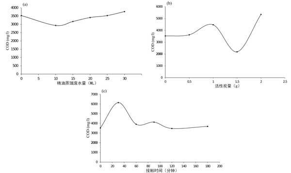圖2:活性炭的參數對吸附COD含量的影響:(a)體積,(b)活性炭重量,(c)接觸時間。