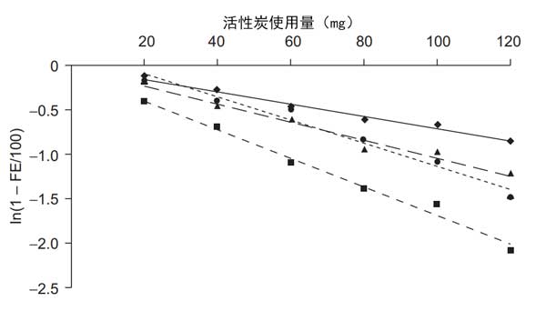 我們測試了增加活性炭微孔體積的效果,以及中孔和大孔的添加。對煙氣量的影響,在圖3中進行了描述。從圖可看出,增加微孔的數(shù)量會導致更大的吸附并因此降低煙氣的產生。中孔/小大孔的加入通過改善向微孔的運輸而導致吸附增強。很明顯,使用微孔/中孔活性炭會導致速率常數(shù)的增加,通常增加了約20倍。