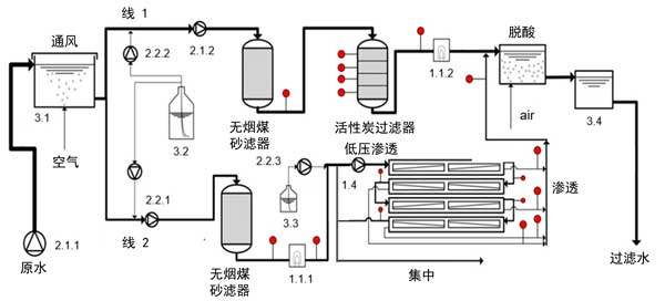 半技術(shù)試驗(yàn)工廠安裝了電氣安裝,工廠控制和數(shù)據(jù)管理。中試工廠由兩條處理線活性炭和反滲透膜(參見(jiàn)圖1)組成,具有17個(gè)采樣點(diǎn)。充氣后的原水通過(guò)增壓泵2.1.1和2.1.2從儲(chǔ)水箱(3.1)連續(xù)泵出。將痕量有機(jī)污染物(3.2)注入標(biāo)有2.2.1和2.2.2的泵的吸入側(cè),以確保適當(dāng)?shù)臎_洗混合和良好的分散性。加水后的水以平行模式通過(guò)無(wú)煙煤砂濾池以及隨后的活性炭(線1)和反滲透膜(線2)。每月對(duì)粒子過(guò)濾器進(jìn)行反沖洗。為了測(cè)試紫外線消毒在反滲透膜之前作為減少生物結(jié)垢的附加預(yù)處理步驟的效果,在活性炭砂濾池的下游操作了紫外線裝置(1.1.1)。反滲透膜管線的進(jìn)料通過(guò)兩個(gè)濾筒過(guò)濾器進(jìn)行預(yù)處理,兩個(gè)濾筒過(guò)濾器依次安裝了80和5μm的標(biāo)稱截止值。