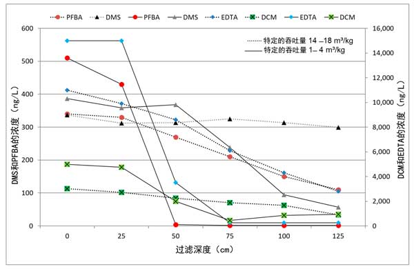 圖2:活性炭過(guò)濾器中痕量有機(jī)污染物的深度依賴濃度曲線。