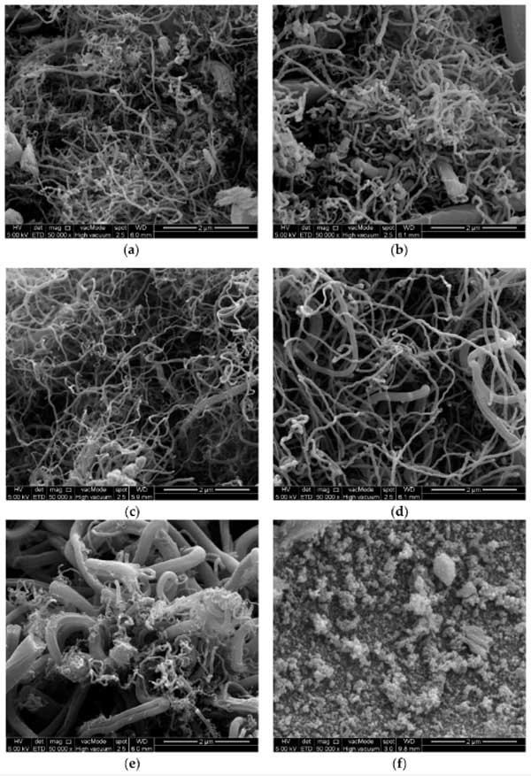用FESEM技術(shù)分析了合成樣品的形態(tài)特征。圖2a-f顯示了放大的50,000倍的六個(gè)選定活性炭樣品圖像。圖2c顯示了活性炭5的FESM圖像,通過(guò)使用5%的鐵作為單催化劑和40分鐘的反應(yīng)時(shí)間,發(fā)現(xiàn)炭產(chǎn)率和接觸角較高。在此樣本中發(fā)現(xiàn)了兩種類(lèi)型的碳納米材料,分別是碳納米纖維和多壁碳納米管。圖2f顯示了活性炭3的FESEM圖像,該圖像是通過(guò)使用4%的鈷作為單催化劑和40分鐘的反應(yīng)時(shí)間制備的。發(fā)現(xiàn)僅使用大量的鈷作為催化劑產(chǎn)生非常差的炭產(chǎn)率,這表明材料制備得不怎么好。圖2e顯示了活性炭4的FESEM圖像,該圖像是通過(guò)使用5%的鐵和4%的鈷作為雙金屬催化劑制備的,反應(yīng)時(shí)間為40分鐘。該圖像表明,使用大量的鈷和鐵時(shí),主要生成聚集的炭納米材料和碳納米纖維,因?yàn)檫@樣的實(shí)驗(yàn)條件不是優(yōu)選的。