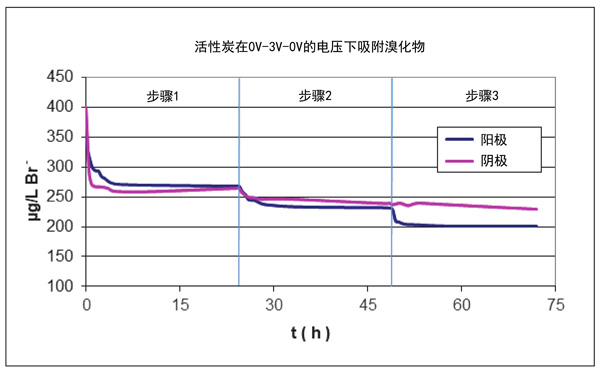 圖4:在三步實(shí)驗(yàn)中的溴化物濃度,第二步對應(yīng)于在3V下進(jìn)行24h的陽極和陰極電吸附實(shí)驗(yàn)。在第二步中施加3V電壓24h,然后將其再次置于開路狀態(tài)24h。
