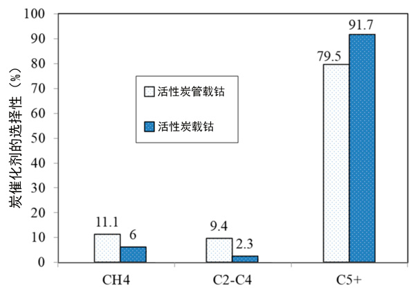 費(fèi)托合成試驗(yàn)是在210℃和2.5MPa的內(nèi)徑為12mm的不銹鋼固定床管式反應(yīng)器中進(jìn)行的。將0.5g催化劑與5.0g碳化硅稀釋劑的反應(yīng)混合物裝入反應(yīng)器中。催化劑在425℃下在N2中的33vol%H2中原位還原10小時(shí)。還原后,將反應(yīng)器冷卻至180℃,并將H2/N2氣體混合物切換為合成氣(H2:CO為2∶1)。在合成氣加壓至2.5MPa然后在4小時(shí)內(nèi)重新加熱到210°C來完成反應(yīng);钚蕴枯d鈷催化劑,活性炭納米管載鈷催化劑的CO轉(zhuǎn)化率分別為13.1%,6.7%。產(chǎn)物選擇性的結(jié)果在圖2中給出。與活性炭管樣品相比,活性炭產(chǎn)生更高的C5+和更低的CH4選擇性,這對(duì)氣體產(chǎn)物(C1-C4)也產(chǎn)生最高的選擇性。