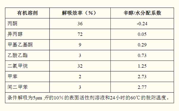 七種有機(jī)溶劑解吸效率表示與圖1。實(shí)驗(yàn)條件5米升的10%的表面活性劑溶液和60℃24個(gè)小時(shí)解吸溫度。的有機(jī)溶劑的解吸效率是3%,72%,9%,3%,32%,2%,而對于丙酮,異丙醇,甲基乙基酮,醋酸乙酯,二氯甲烷,甲苯,和3%的米二甲苯。