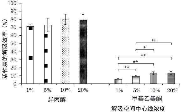 如示于圖2所示,異丙醇的解吸效率不會受表面活性劑濃度。然而,在甲基乙基酮中,當(dāng)表面活性劑濃度增加至10%時(shí),解吸效率增加。表面活性劑的去污力和增溶能力都有助于有機(jī)溶劑從活性炭中解吸附。